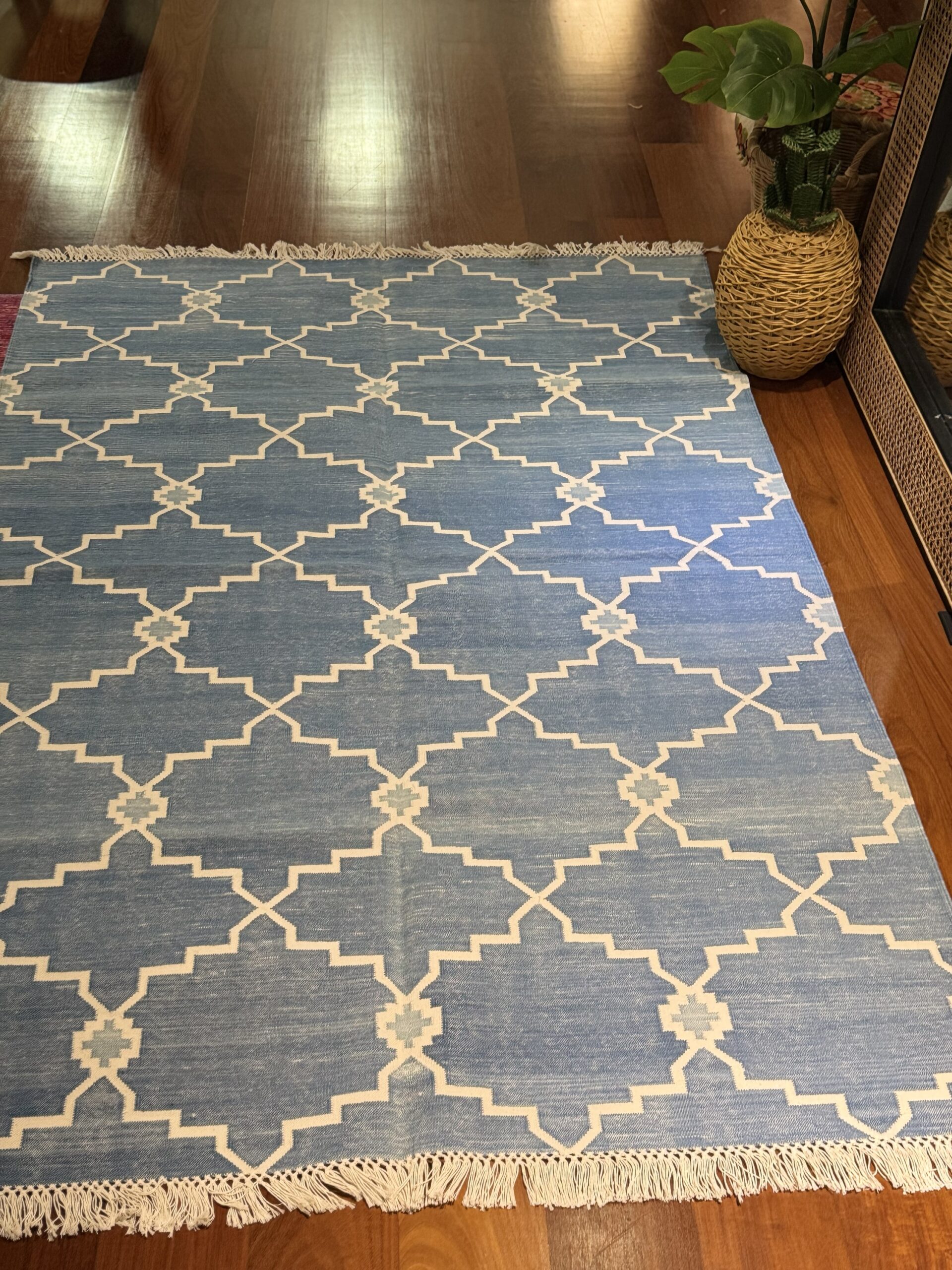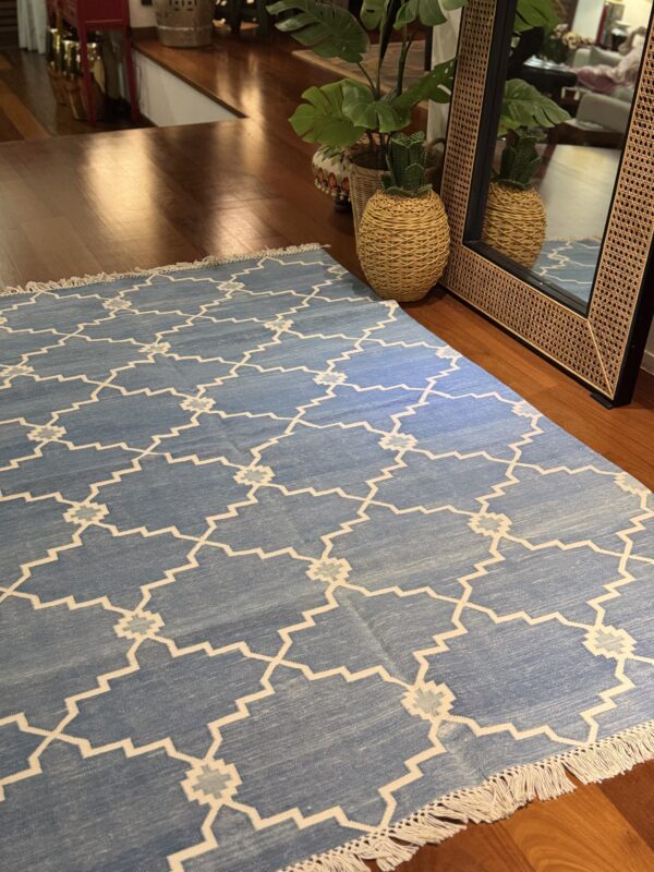 DESCRIPTION: Blue & Ivory is a classic trellis design, perfectly fitting for modern, traditional and transitional homes. The beauty of these handmade dhurrie is that they are reversable. Add a touch of colour and design to your space.