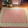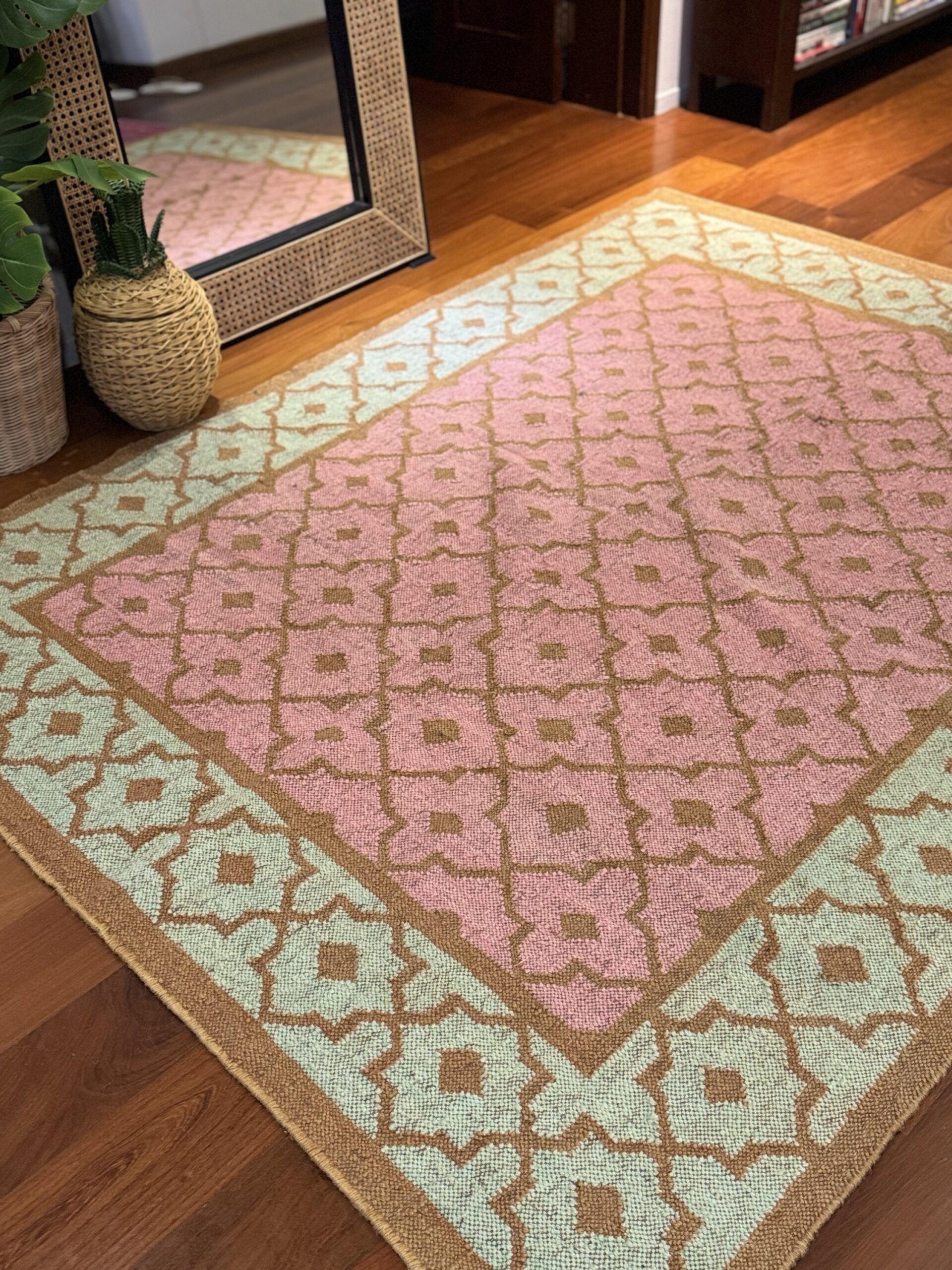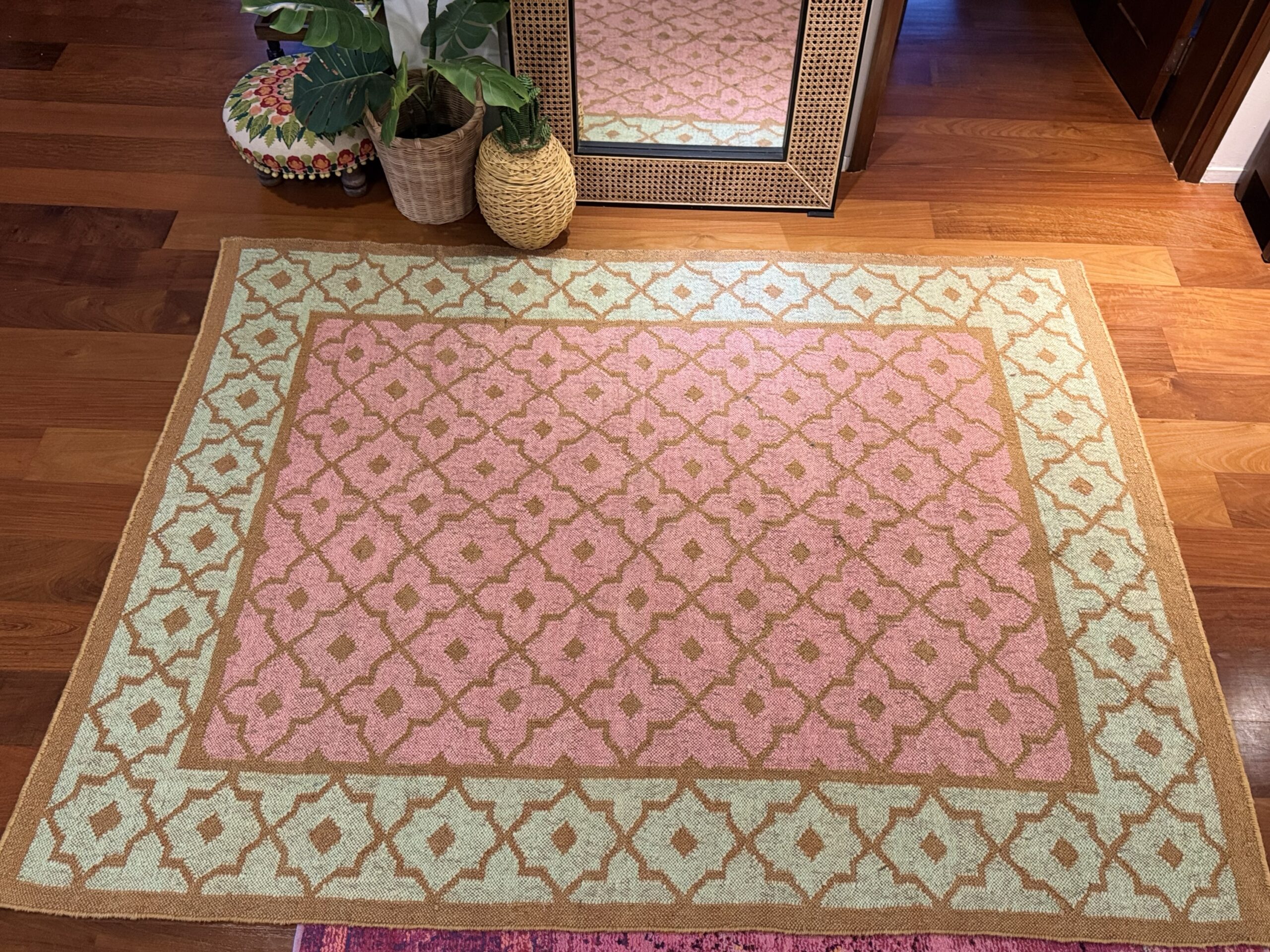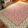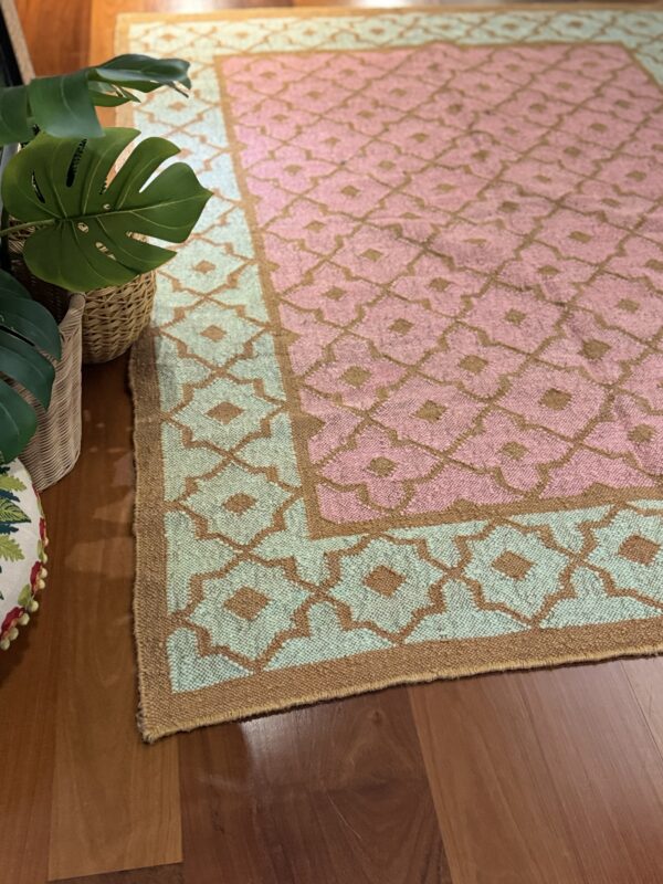 DESCRIPTION: This rug features a soft pastel palette with a warm, peach-pink center framed by a fresh mint green border. The entire surface is decorated with a repeating diamond lattice pattern in muted gold, giving it a structured yet delicate look. The flatweave texture keeps it lightweight and versatile, while the colors bring a cheerful yet elegant vibe. It’s the kind of rug that can instantly brighten up a space—perfect for under a console table, in an entryway, or even in a cozy living corner. The design blends traditional geometric motifs with a modern pastel twist, making it both timeless and contemporary.